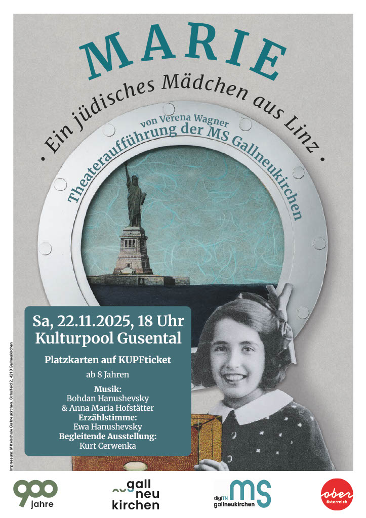 Die Mittelschule Gallneukirchen beteiligt sich rege an den 900-Jahre-Jubiläumsfeiern der Stadt. Die Theatergruppe wählte für die diesjährige Aufführung das Buch “Marie – ein jüdisches Mädchen aus Linz” der Gallneukirchnerin Verena Wagner.